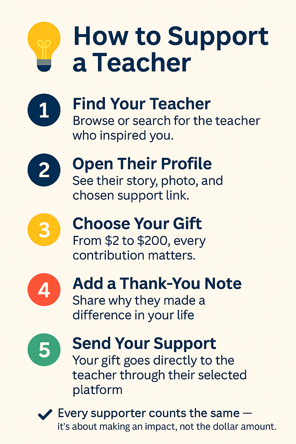 At SupportMyTeachers.com, we make it easy to say thanks in the most meaningful way possible — by donating directly to a fund or platform of a teacher’s choice. This isn’t a donation to a school district or a general classroom fundraiser. It’s a personal show of gratitude, directed to the teacher’s preferred fund or account, so they can use it however helps them most.